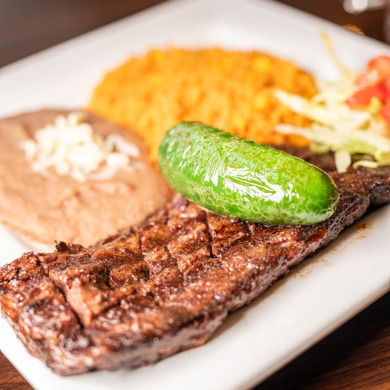 Tender skirt steak served with Mexican rice, beans and corn or flour tortillas.